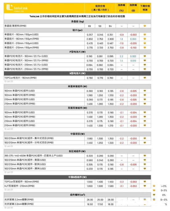 本周价格反应7月订单状况,价格持续缓降,其中一线厂家新签订单价格PERC单玻组件约落在每瓦1.3-1.35元人民币,部分二三线报价也有约1.25-1.3元的水平。