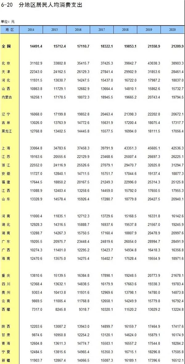 此外,《中国统计年鉴2021》中,另一组关于人均消费指出的数据也显示出,中国人在2020年比过去更喜欢存钱了:全国居民人均消费支出自2014年以来首次出现下滑,31个省级行政区中,有20个出现人均消费支出减少。