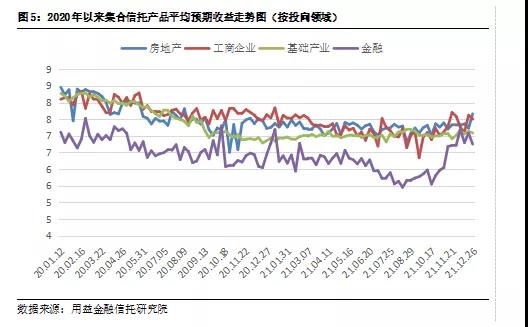 据统计,上周金融类信托产品的平均预期年化收益率为6.75%,环比减少0.33个百分点;房地产类信托产品的平均预期年化收益率为7.66%,环比增加0.43个百分点;工商企业类信托产品的平均预期年化收益率为7.50%,环比减少0.12个百分点;基础产业类信托产品的平均预期年化收益率为7.09%,环比减少0.04个百分点。
