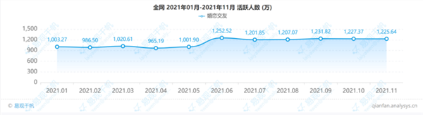 据易观千帆最新数据,截至2021年11月,我国与婚恋交友相关的APP共179个,行业整体活跃人数达1225.64万人,环比下降0.14%。可见,在单身人群中主动使用婚恋交友网站的人数占比有限。