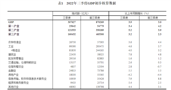 从三季度看,我国GDP为307627亿元,按不变价格计算,同比增长3.9%,比二季度加快3.5个百分点。三季度,工业发展快速回升,增加值同比增长4.6%。同时三大需求持续回升。三季度最终消费支出、资本形成总额和货物和服务净出口对经济增长贡献率分别为:52.4%,20.2%和27.4%。