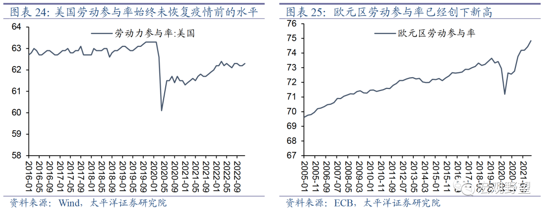 总结各国疫情防控政策放开后人员流动恢复情况的经验,我们认为疫情期间过量的财政补贴和后疫情时代持续较为严格的防控政策可能是阻碍居民外出工作及日常出行的主要原因,除此之外的其它国家的人员流动恢复状况普遍较好。中国在疫情期间没有推出非常强力的政策刺激,而且目前疫情防控政策已经近乎全面放开。所以我们认为在疫情的第一波冲击过后,中国境内及跨境的人员流动也将出现较好的恢复。相应的,此前一直被压抑的总需求也会随着人员流动的恢复而改善。我们再来从供给端的角度观察疫情后各国劳动参与率的情况:首先,从国家间对比来看,我们认为中国不易出现劳动力的长期短缺。疫情三年,至今为止,只有美英等少数国家出现了劳动参与率的持续下降,这主要是由于其大量的财政补贴降低了居民外出工作的意愿。而没有进行直接财政补贴、而是更加鼓励就业的欧元区的劳动参与率早已创下历史新高。这反映出美英等国居民疫情后持续的劳动意愿的下降并非普遍现象。