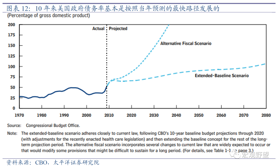 从美国历史经验来看,货币政策通常比财政政策更容易“妥协”。美国财政预算需要国会两院和白宫共同决定,通常博弈较为激烈。历届政府也大多不愿在自己的任期内实施大规模的财政紧缩。美国国会预算办公室(CBO)每年都会发布未来的政府债务率预测。对比2010年CBO发布的财政预算报告,可以看出10年来美国实际债务率的增长基本是按照当年最快的假设路径来发展的。这也反映出美国财政紧缩的阻力确实较大。所以,在极高的政府债务率的背景下,美联储的货币政策实际上面临很大的压力,尤其是这一压力会滞后发生,需要提前应对。因此我们认为美联储货币政策的空间已经不大,可能在一季度两次加息之后,就会终止加息周期。