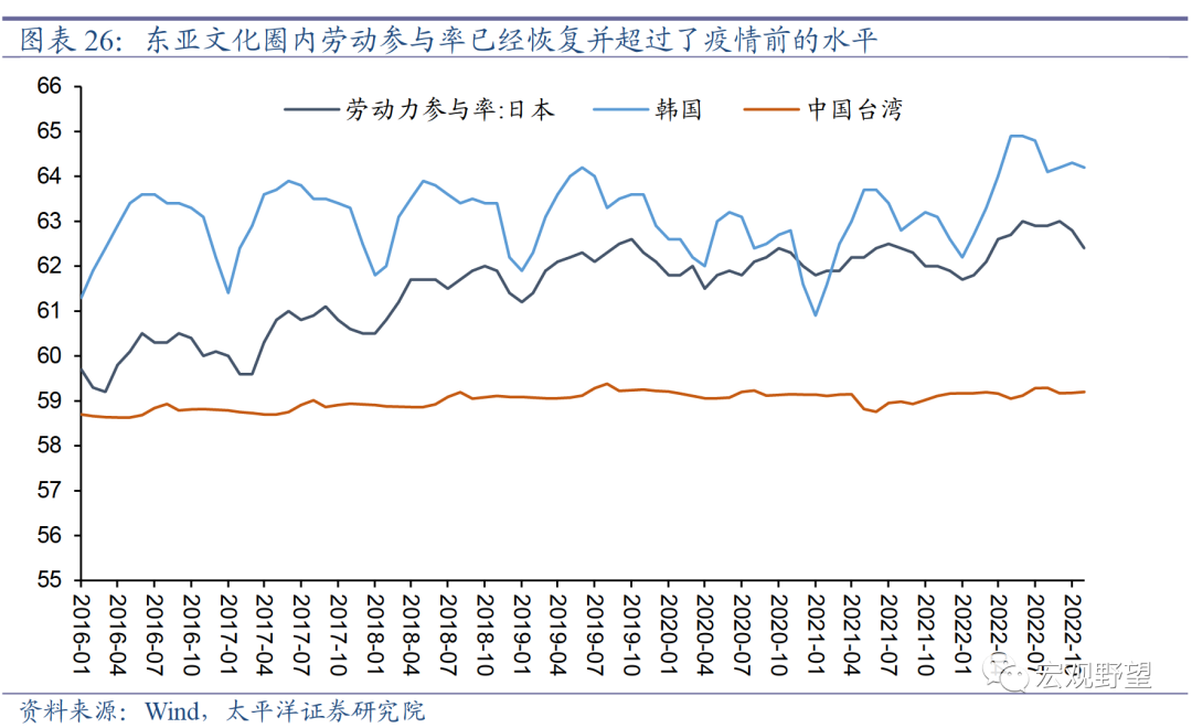 在东亚地区,日本、韩国、中国台湾目前的劳动参与率水平均以恢复并超过了疫情之前的水平,这反映出儒家文化圈内居民参与劳动的意愿并未因为疫情的影响而长期低迷。民众的工作意愿反而是在上升的。