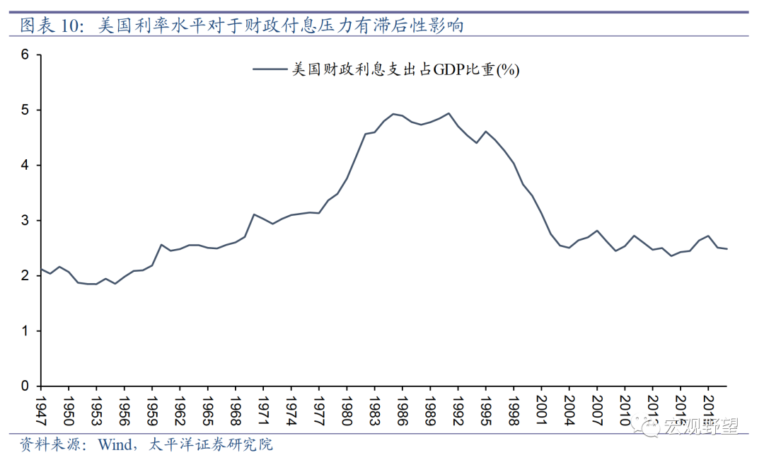 2.1. 美联储加息周期即将停止2022年美联储进行了40年以来最快速度的加息进程,联邦基金基准利率水平从年初的零利率迅速提升至年底的4.25%-4.5%区间。基准利率的提升带动了整体利率曲线上移,给全球资本市场造成了巨大打击。在美国高通胀的背景之下,美联储加息是被迫之举。但从长期的角度来看,当前的利率水平对于美国财政状况而言已经不可持续。利率上升会导致美国财政支付利息的压力增大,不过二者之间是有时间滞后的。因为美国大部分国债是固定利率,所以只有到债券到期借新还旧之时才会出现债务利率水平的上升。也就是说,美联储加息之后,美国财政付息的压力不会立刻跳升,但是会在此后的几年里逐渐上升。美国历史上财政利息支出占GDP的比重在上世纪80年代中后期达到最高,接近5%的水平,这就是80年代初美联储快速加息带来的滞后性效果。当前美国总债务规模正处于历史最高位,如果利率水平维持在4%以上,那么对应未来几年后美国财政利息支出占GDP的比重将超过5%,达到历史最高。而美国过去20年中名义GDP的平均增速只有4%左右,远低于上世纪80年代和90年代的水平,这意味着美国财政将无法承受逐渐上升的债务压力。