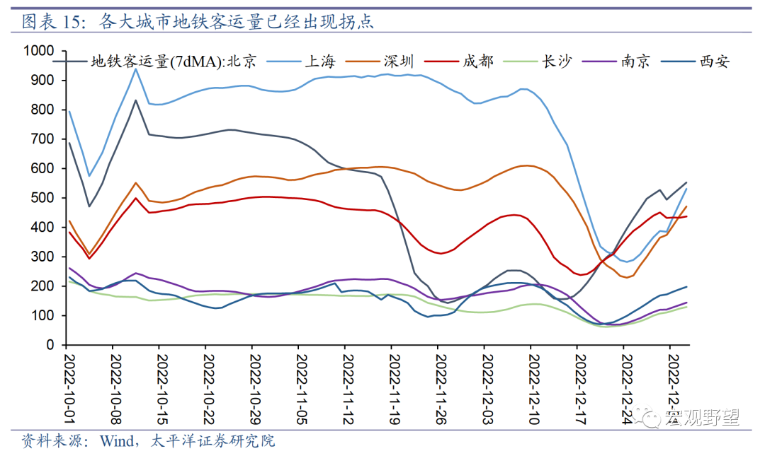 从疫情节奏的角度来看,我们认为目前中国疫情的反弹可能已经达到峰值。根据其它国家的经验,各国在奥密克戎病毒出现且防疫政策放开之后,往往会出现不止一轮的疫情反弹,但是绝大多数国家第一轮疫情的日增病例数峰值是最高的,此后反弹的峰值都会逐渐下降。所以我们认为防疫政策放开后第一轮疫情的冲击是最大的,也是最值得关注的。各国第一轮疫情的日增病例数从底部到峰值通常需要1-3个月时间,具体的时长和各国疫情防控政策关系较大。防控政策越宽松的国家,疫情达峰越快。中国本轮疫情从2022年10月份开始反弹,初期防控仍然较为严格,11月下旬之后疫情防控政策放松的步伐较快,所以中国疫情“闯关”的时间可能在3个月左右,即2023年1月份可能就是第一轮疫情的峰值。从部分重要的一二线城市的地铁客运量数据来看,各大城市地铁客运量已经在12月份出现了拐点,反映出这些地区的疫情达峰可能已经完成。广大中小城镇和农村可能相对较慢,我们认为在春节前的大规模人员流动的影响下,全国整体上的新增感染数应能在1月份达到峰值,此后逐渐回落。所以,目前正是疫情对经济冲击最大的时期,在1月份之后,随着新增感染人数逐步减少,社会人员流动和经济将会进入复苏期。此后虽然疫情可能会出现若干次的反复,但基准情形下对于经济的冲击将会越来越弱。