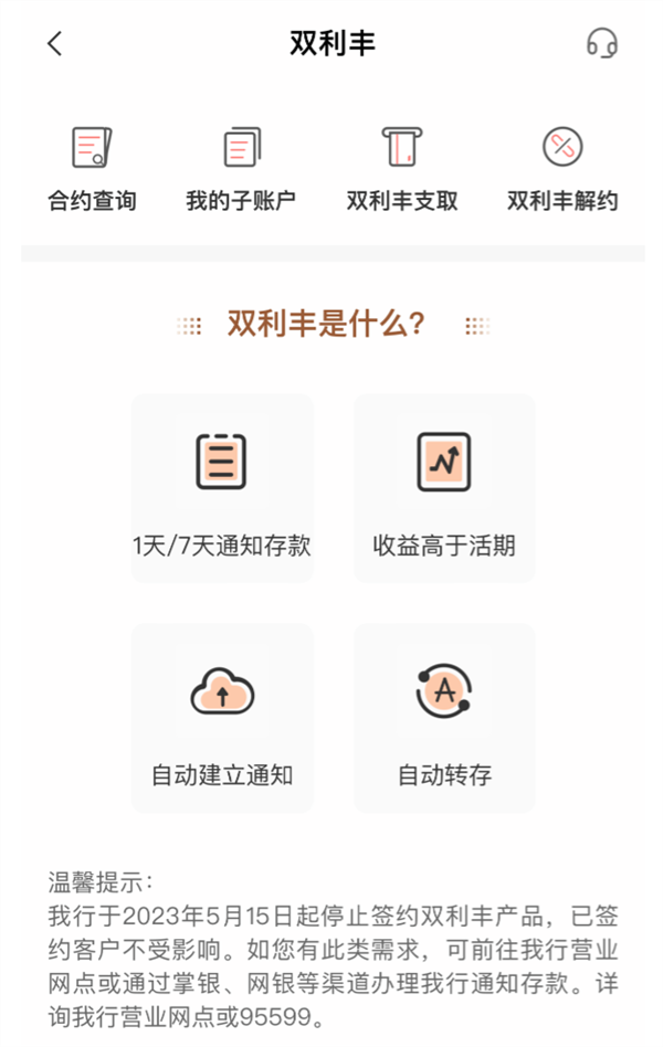 农业银行App显示,该行存款专区中的“双利丰”于5月15日起停止签约,已签约客户不受影响。“双利丰”即为该行的智能通知存款,可自动建立通知,自动转存。此前该行7天期通知存款最高年化利率可达1.75%。