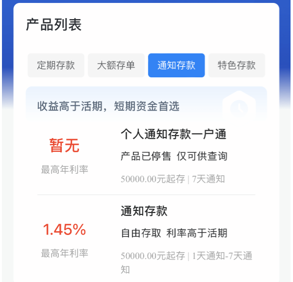 建设银行App显示,该行存款产品专区,通知存款列表下的“个人通知存款一户通”产品已停售,目前仅可供查询;下方的通知存款最高年化利率为1.45%,与工商银行保持一致,也是较央行基准利率均加点0.1个百分点。