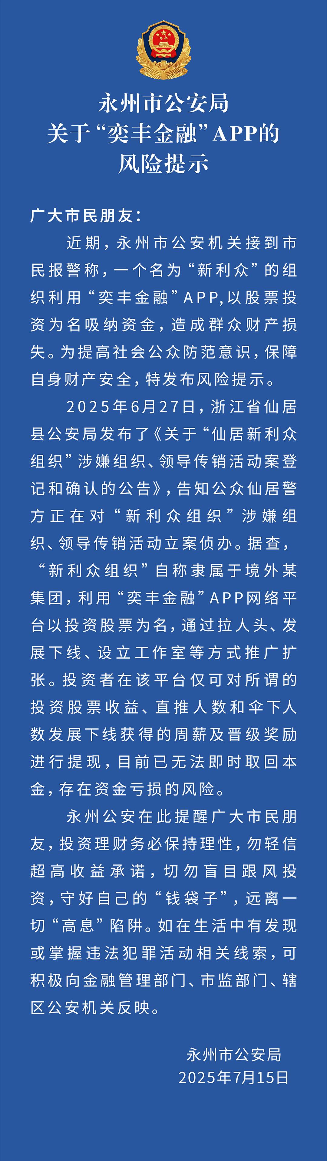 - 2025-07-29永州公安:关于“奕丰金融”APP