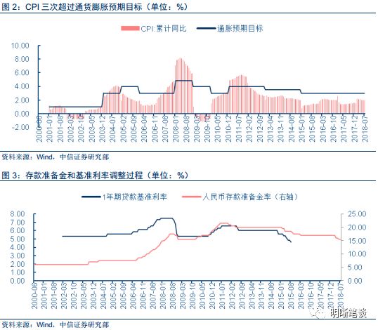 抑制通货膨胀是货币政策的重要目标之一,因此官方通胀目标对货币政策具有指导意义,但是官方通胀目标并不一定是货币政策转向的参照标准。十多年以来,我国出现了三次通货膨胀增速超过官方通胀预期目标的情况,分别出现在2003年年底、2007年以及2010年底。三次通货膨胀高于目标的情况各有不同,但是后两次通货膨胀率在高于目标之前,央行的货币政策已经有所收紧。