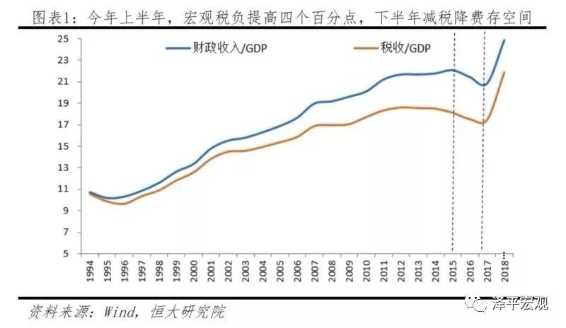我国税收收入/GDP比重从2013年的18.6%下降至2017年的17.5%,财政收入/GDP比重从2015年22.1%下降到2017年的20.9%,体现减税降费成果。但是2018年上半年,上述指标分别上升4.4和4个百分点至21.9%和24.9%。