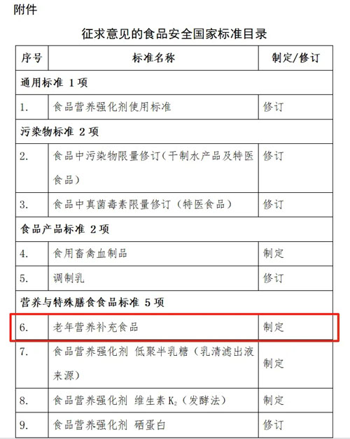 8月1日,食品安全国家标准审评委员会秘书处发文于征求《食品安全国家标准 食品营养强化剂使用标准》等30项食品安全国家标准(征求意见稿)意见,其中《食品安全国家标准 老年营养补充食品》作为我国首个针对老年人群的营养补充食品强制性国标,被列入《征求意见的食品安全国家标准目录》第 5 项。标志着长期 “野蛮生长” 的银发营养市场,即将迈入标准化、规范化发展的新阶段。