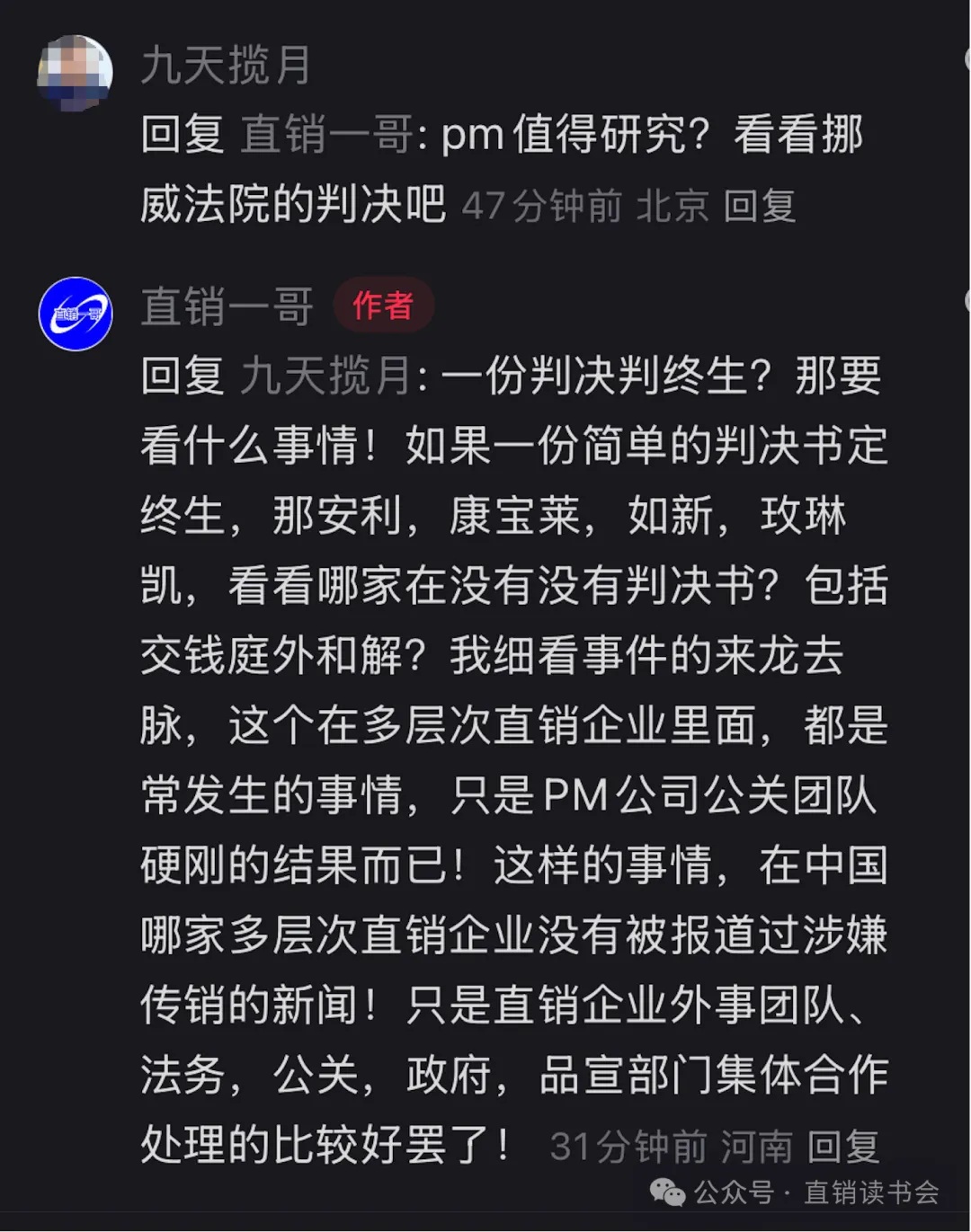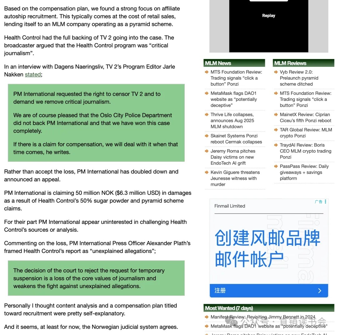 该案也反应出来PM International缺乏国际人才,硬刚媒体,无论在言论自由的国家,还是其他国家这个都是直销行业大禁忌。缺乏国际视野的法务、公关部以及品牌宣传部,虽然业绩上来,走的都是灰色地带,也就是跨国电商的方式,若不引进适合国际视野职业经理人团队,单纯的创始人一个人,走不远,也走不久!至少,在中国是行不通!