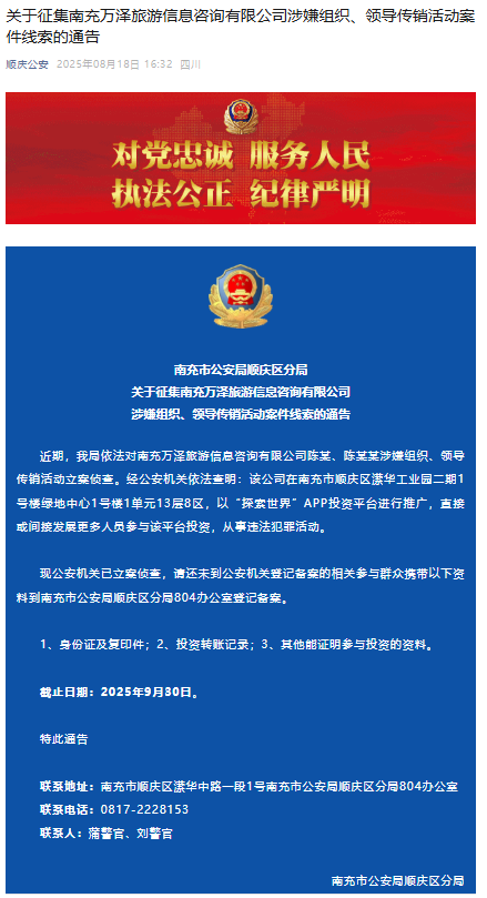 近期,我局依法对南充万泽旅游信息咨询有限公司陈某、陈某某涉嫌组织、领导传销活动立案侦查。经公安机关依法查明:该公司在南充市顺庆区潆华工业园二期1号楼绿地中心1号楼1单元13层8区,以“探索世界”APP投资平台进行推广,直接或间接发展更多人员参与该平台投资,从事违法犯罪活动。现公安机关已立案侦查,请还未到公安机关登记备案的相关参与群众携带以下资料到南充市公安局顺庆区分局804办公室登记备案。1、身份证及复印件;2、投资转账记录;3、其他能证明参与投资的资料。截止日期:2025年9月30日。