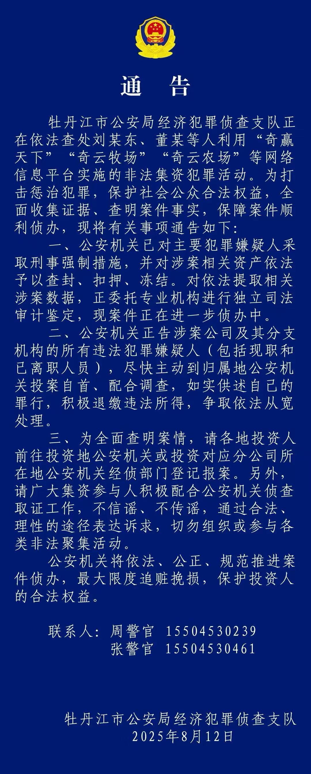 ●牡丹江公安关于“奇赢天下”、“奇云牧场”、“奇云农场”等网络平台非法集资犯罪活动的通告来了!