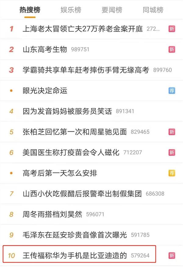 6月10日下午,#王传福称华为手机是比亚迪造的#冲上微博热搜。