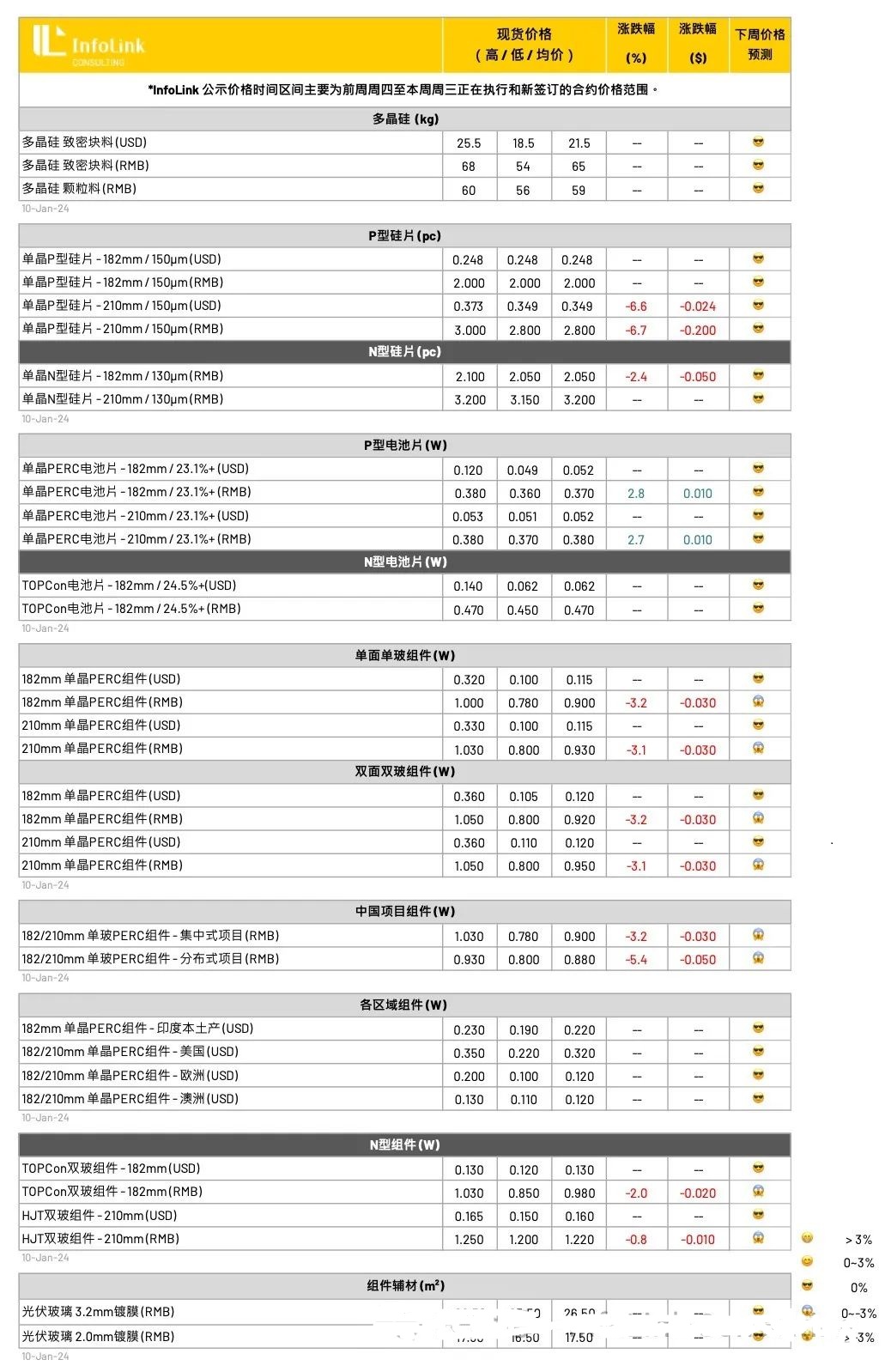 在N型电池片部分,本周TOPCon(M10)电池片主流成交价格保持相对稳定,效率的严重分化造就了N型电池的价格差异,筛选24.5%及以上的高效档位,均价价格维持落在每瓦0.47元人民币左右,TOPCon与PERC电池片价差维持每瓦0.1元人民币不等。而HJT(G12)电池片生产厂家多数以自用为主,外卖量体尚少,高效部分价格落在每瓦0.6元人民币左右。