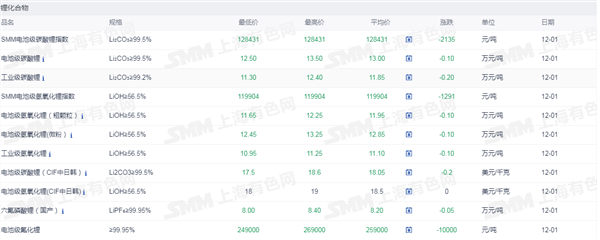 证券之星新能源车行业周报:据上海有色网,截止12月1日,电池级碳酸锂12.50-13.50万元/吨,均价13.00万元/吨,环比上一工作日下滑0.10万元/吨;工业级碳酸锂11.30-12.40万元/吨,均价11.85万元/吨,环比上一工作日下滑0.20万元/吨。供应端,近期部分上游大厂开始逐步放出前期储备库存,锂盐市场流通有所增量,但当前下游采买需求依旧疲软,供强需弱之下,市场看跌情绪依旧浓重,价格承压下行。