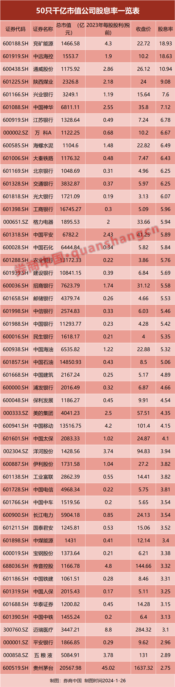 A股一批千亿市值蓝筹股的股息率超过了十年期国债收益率,更超过银行的5年期定存。比如,格力电器当前股价对应的股息率为5.94%,美的集团股息率为4.35%、中国移动和中国电信的股息率均超过3.8%,陕西煤业和中国神华的股息率均超过7%。