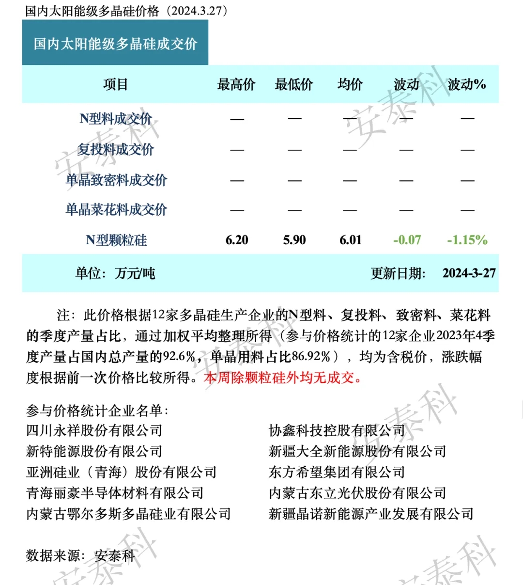证券之星光伏行业周报:中国有色金属工业协会硅业分会数据显示,本周上下游僵持博弈,签单量极少。预期近期硅片企业有减产预期,故短期内对多晶硅需求无明显修复迹象。国金证券最新观点指出,1-2月海内外需求超预期,2024年需求弹性有望持续超预期。宏观方面,国家发改委、工信部等18部门指出,围绕新能源、新材料等产业领域适度超前研制相关标准。企业方面,银星能源发布关于参股公司破产程序终结的公告,参股公司宁夏银星多晶硅有限责任公司破产程序终结民事裁定书。星帅尔发布公告称,中国能建东电二公司确定向子公司富乐新能源购置光伏组件设备,合同总价为10.14亿元。