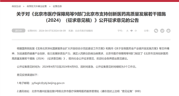 4月7日深夜,北京医保局突然发布创新药重磅利好。公告称,根据国务院批复《支持北京深化国家服务业扩大开放综合示范区建设工作方案》和我市《关于生物医药全产业链开放实施方案》等文件精神,为加速医药健康产业创新,助力发展新质生产力,满足人民群众防病治病需求,北京市医疗保障局等9部门制定了《北京市支持创新医药高质量发展若干措施(2024)(征求意见稿)》,现向社会公开征求意见,欢迎社会各界提出意见建议。公开征集意见时间为:2024年4月7日至2024年4月9日,因时间紧急,公开征集意见时间缩短为3个工作日。