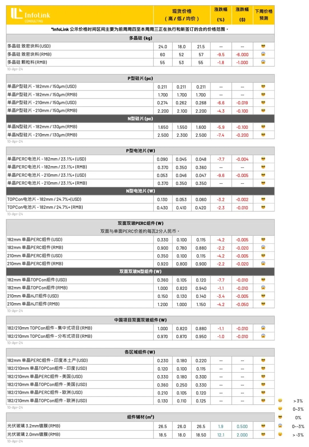 而海外价格部分,近期新签单执行,PERC价格执行约每瓦0.1-0.11美元,TOPCon价格则因区域分化明显,欧洲及澳洲区域价格仍有分别0.12-0.13欧元及0.12-0.13美元的执行价位,然而巴西中东等市场价格也开始悄然下降至0.11-0.12美元的区间,美国价格二季度订单较少,价格仍以前期集中式项目执行为主0.33-0.35美元的区间,部分厂家受政策纷扰影响尝试抬高东南亚出厂的组件价格。HJT部分则暂时持稳约每瓦0.13-0.15美元的水平。