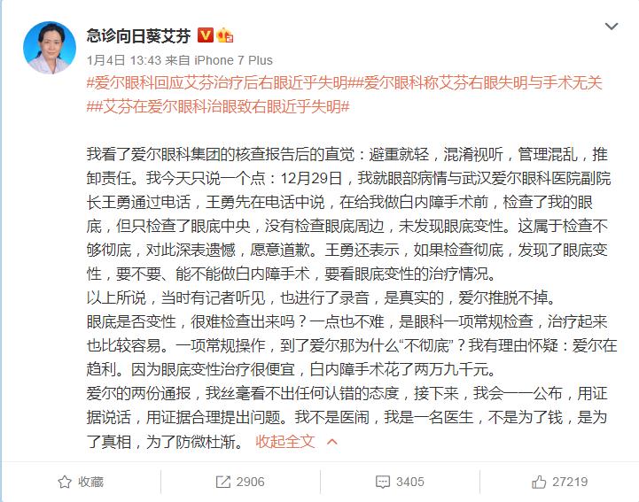 2020年12月31日,武汉市中心医院急诊科主任艾芬发微博称,自己经熟人介绍,同年5月在武汉大学附属爱尔眼科医院做白内障手术后,右眼视网膜脱落,接近失明。艾芬认为,武汉爱尔眼科在术前和术中未能遵守医疗规范,才导致了自己术后视力恶化。爱尔眼科进行了内部调查并发布报告,但艾芬医生并不买账,并拒绝第三方介入。