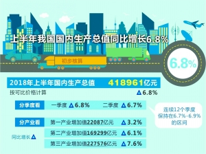 国家统计局昨日公布数据显示,今年上半年GDP同比增长6.8%,其中一季度增长6.8%,二季度增长6.7%,连续12个季度稳定运行在6.7%到6.9%的中高速区间。