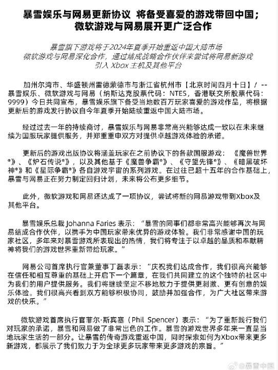 在暴雪和网易官宣的同时,公告指出,微软游戏和网易还达成了一项协议,尝试将新的网易游戏带到Xbox及其他平台。这意味着网易将不仅只是暴雪游戏的中国代理商,也将有机会成为微软系游戏平台的开发商之一。