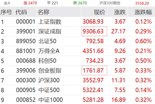 A股早间小幅低开:上证指数跌幅为0.2%,报3059.06点;深证成指跌幅为0.55%,报9228.18点;创业板指跌幅为0.97%,报1739.01点。上午市场震荡回暖,创业板指从跌超1%拉升翻红。截至发稿,主要指数全线飘红。