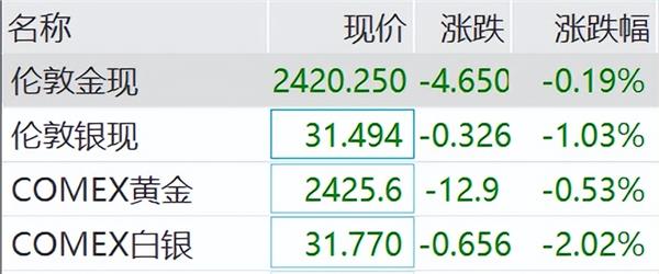 另外,现货黄金、白银均出现跳水现象。伦敦金现小幅跳水,伦敦银现跌超1%,此前盘中涨超2%。COMEX黄金走低,COMEX白银跌超2%。