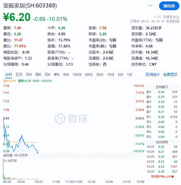 另外,近期“5连板”的牛股亚振家居,上午开盘跌停。截至发稿,重回跌停线。