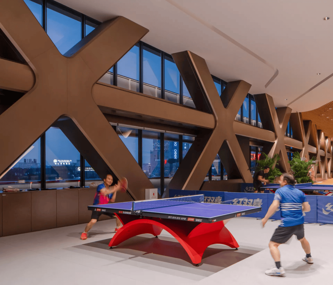 连接建筑两部分的柔和曲线桥梁以动态的方式蜿蜒。它们容纳了公共空间,如健身房、休闲区、餐厅和咖啡馆,增强了建筑群的功能性。