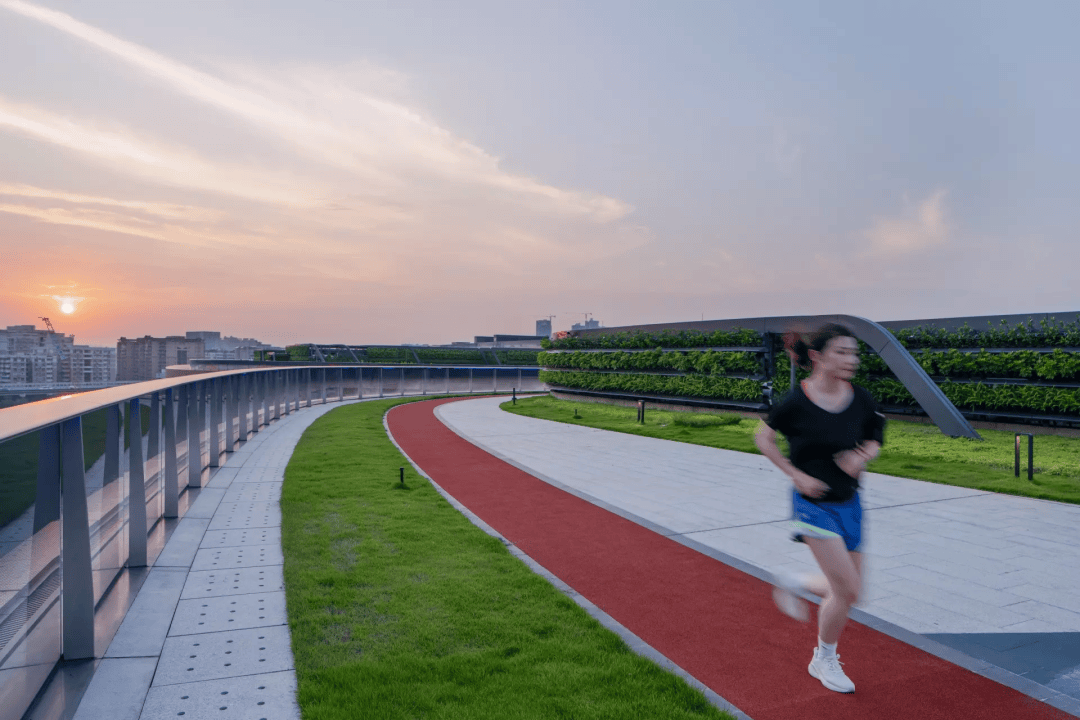 这些面板不仅赋予了建筑物独特的外观,还起到了实际的功能,减少了广州亚热带气候中室内热量的积聚。绿色屋顶作为第三、第七和第八层的广阔露台,几乎占据了屋顶面积的一半,与周围环境融为一体,强调了项目的生态使命。
