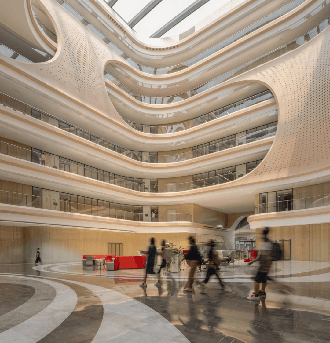无限极广场设计基于无限循环的概念,围绕中央中庭和庭院组织空间。这种布局创造了开放、多功能的内部空间,促进了无限极公司各部门之间的互动。