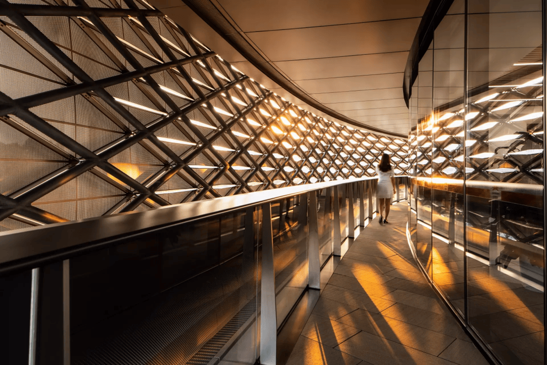 两座建筑通过桥梁相连,形状像交织的丝带。每座建筑有八层,它们的立面覆盖着穿孔铝板,创造出一种节奏感强、镂空的结构。
