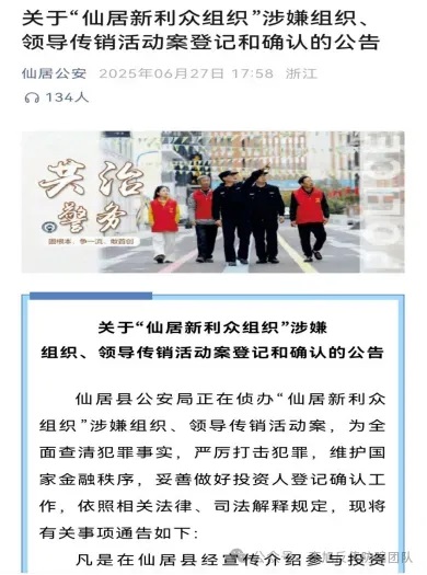 2025年6月27日,浙江省仙居县公安局发布了《关于“仙居新利众组织”涉嫌组织、领导传销活动案登记和确认的公告》,告知公众仙居警方正在对“新利众组织”涉嫌组织、领导传销活动立案侦办。近期,有网民反映,“新利众组织”在我市某县开展活动。“新利众组织”通过“奕丰金融”平台进行股票投资,承诺高额收益,存在较大风险。该组织自称隶属于境外某集团,以投资股票为名,通过拉人头、发展下线的方式扩张。主要针对缺乏金融知识的中老年人,通过开设线下实体店、定期召开视频会议等方式使不明真相的群众无法保持谨慎,投资者在该平台仅可对所谓的“投资收益”发展下线获得的分享金及成团奖励进行提现,但无法即时取回本金,存在资金亏损的风险。衡阳公安提醒广大市民朋友,切勿轻信所谓“高收益、低风险”的投资项目,尤其是通过拉人头、发展下线的方式盈利的组织。请大家切实增强守法意识和风险意识,守护好自己的“钱袋子”,如在生活中有发现和掌握违法犯罪活动相关线索,可积极向市场监督管理部门和公安机关反映。