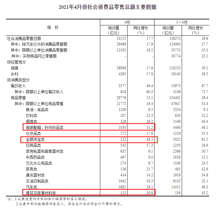 1-4月份,城镇消费品零售额120233亿元,同比增长30.1%,两年平均增长4.3%;乡村消费品零售额18140亿元,增长26.5%,两年平均增长3.4%。