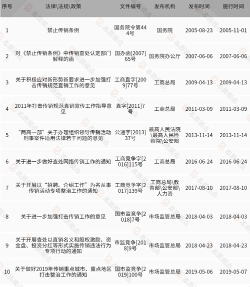 真正制约着中国直销业健康发展的,是传销违法行为的屡禁不止。虽然与打传直接相关的文件最晚出现于2019年5月6日,但执法部门对传销违法行为的打击与查处从来没有中断过。间接涉及到打击传销违法行为的相关法律法规有10项,以时间顺序排列如下: