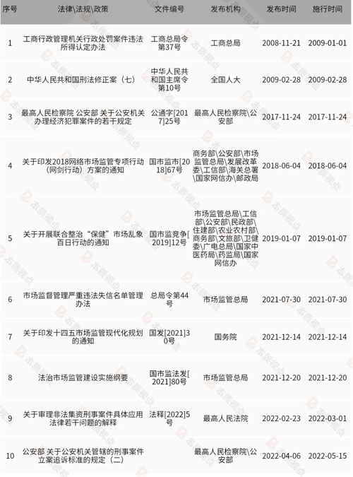 3. 5个部委分别是国务院办公厅、公安部、市场监管总局、人力资源和社会保障部、教育部。作为直销市场行为监管与传销违法行为查处的最高行政执法部门,市场监管总局参与了10件法规规定中的7件;公安部参与了其中2件;国务院办公厅、人力资源和社会保障部、教育部分别参与了1件规定的制订发布。