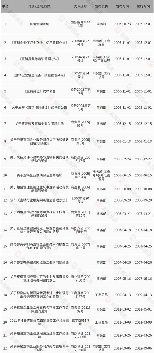 直接与直销有关的法律法规及政策性文件42件,按时间顺序排列如下: