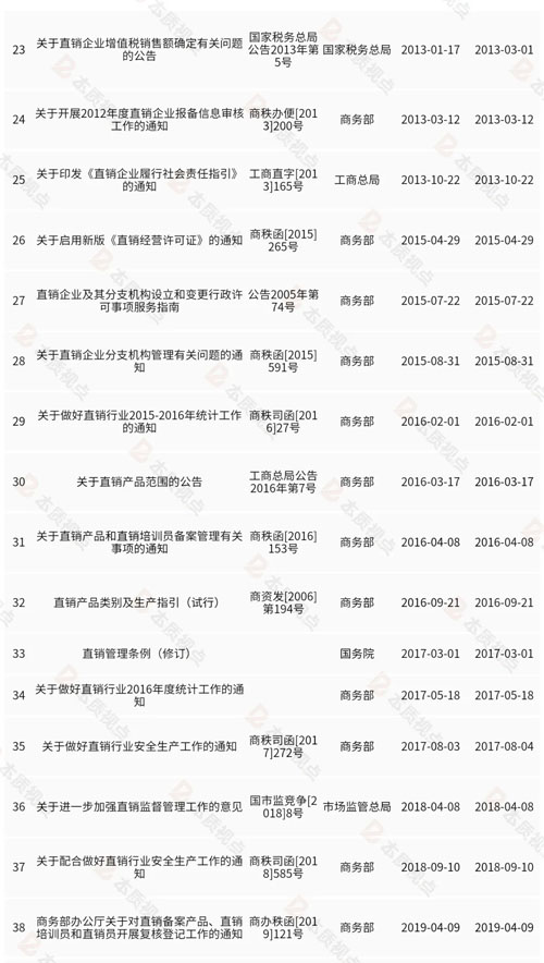 本质视点传媒在梳理直接或者间接的法律法规文件中,以下法律法规对直销行业产生过相对重大的影响。