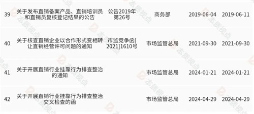 6. 《关于核查直销企业以合作形式变相转让直销经营许可问题的通知》:2021年9月30日,市场监管总局首次以公开的公文形式发布的对直销企业“挂靠”行为的专项整治,旨在遏制直销企业越演越烈的“挂靠”经营。不过市场对该文件的态度泾渭分明,有支持的,有反对的。事实上,相关法规的发布不仅没有遏制住直销企业的“挂靠”冲动,反而有愈演愈烈、遍地开花的趋势。2023年11月29日,市场监管总局价监竞争局在沈阳召开“调研治理直销企业挂靠问题的意见和建议”座谈会,布置对直销企业“挂靠”行为的整治。2023年12月中旬,一份用词严厉的《关于开展直销挂靠行为专项排查治理行动的通知》在网上传开,不过这份文件最终没有发出,取代该《通知》的是2024年1月下旬,由市场监管总局规范直销与打击传销办公室发布的《关于开展直销行业挂靠行为排查整治的通知》。本质视点从观察者的角度建议,对某些市场行为应堵疏结合,在打击通过“挂靠”贩卖直销经营资质的同时,也应进一步细化“挂靠”与“合作”的界定标准,平衡执法与企业发展需求,鼓励直销企业在规范框架内探索创新模式,实现直销业的规范持续发展。