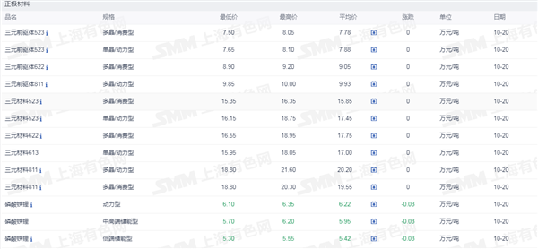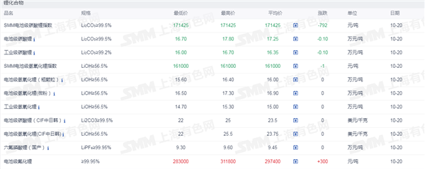 证券之星新能源车行业周报:据上海有色网,截止10月20日,电池级碳酸锂16.70- 17.80万元/吨,均价17.25万元/吨,环比上一工作日下滑0.1万元/吨;工业级碳酸锂16.0-16.7万元/吨,均价16.35万元/吨,环比上一工作日下滑0.1万元/吨。近期锂盐价格走势逐渐趋弱,整体看,当前产业链上下游的僵持行情仍在持续,下游实际需求低迷,对高价锂盐依旧持一种不备、不采的态度,市场整体零单成交较为清淡。而部分厂商在这种情况下,报价下行,市场重心逐步下行,锂盐价格转跌。