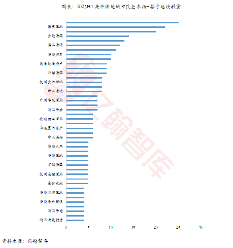 上半年,伟星置业在集中供地城市中参拍+摇号地块数量达到22宗,民营房企中仅次于龙湖集团,最终在南京、合肥、杭州获地4宗;杭州建杭置业参拍+摇号地块13宗,竞得3宗,广东天润置业集团、安徽邦泰参拍+摇号地块数分别为11宗、10宗,均有一宗地块获取。