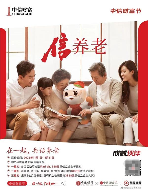 正值个人养老金制度出炉一周年,由中信银行、华夏基金和中信保诚人寿共同主承办的“信”养老主题活动,让客户一站式体验中信在养老领域的六大特色业务“一个账户、一套产品、一个账本、一支队伍、一个平台、一套服务”,客户只要登录“中信财富广场”养老专区,即可浏览和体验从财富管理到品质养老的全方位服务。