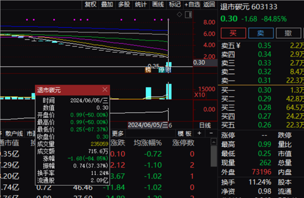 退市碳元今天开盘跌50%,盘中进一步下挫,一度跌87.37%。